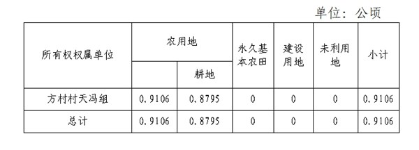 根据拟征收土地现状调查结果,本次拟征收土地面积0.9106公顷(13.659亩),其中:农用地0.9106公顷(13.659亩),含耕地0.8795公顷(13.1925亩)、永久基本农田0公顷(0亩);建设用地0公顷(0亩);未利用地0公顷(0亩)。具体现状如下: