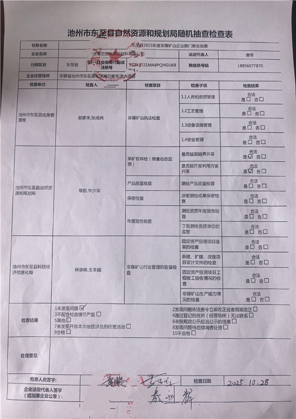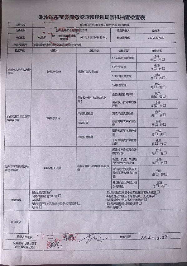 东至县自然资源和规划局2025年10月28日随机抽查结果公示