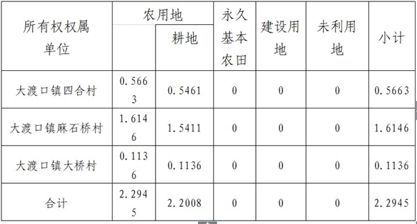 本次批准征收土地面积2.2945公顷(34.4175亩),其中:农用地2.2945公顷(34.4175亩),含耕地2.2008公顷(33.0120亩)、永久基本农田0公顷(0亩);建设用地0公顷(0亩);未利用地0公顷(0亩)。具体现状如下: