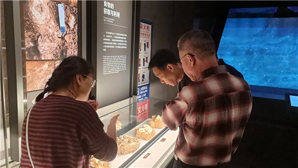 在陈列馆讲解员的引导下,大家依次参观了人类化石、人类文化、动物群三个单元。在人类化石展区,大家近距离观察华龙洞早期人类化石复制品,认真聆听“东至人”的演化历程与考古发现故事;步入人类文化展区,老同志们驻足凝视,仿佛穿越时空与远古人类对话;来到动物群展区,大家惊叹于远古生物的奇特形态。参观过程中,老同志们还主动尝试展区内的数字化多媒体互动设备,现场氛围轻松而热烈。