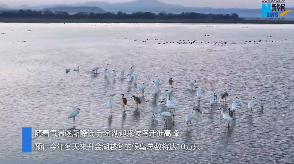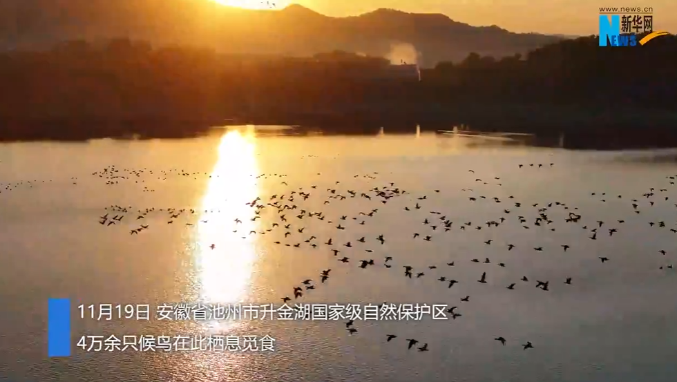 近日,安徽省池州市升金湖国家级自然保护区,4万余只候鸟在此栖息觅食,呈现一幅水清岸绿,飞鸟翔集的生态画卷。随着气温逐渐降低,升金湖迎来候鸟迁徙高峰,预计今冬来升金湖越冬的候鸟总数将达10万只。