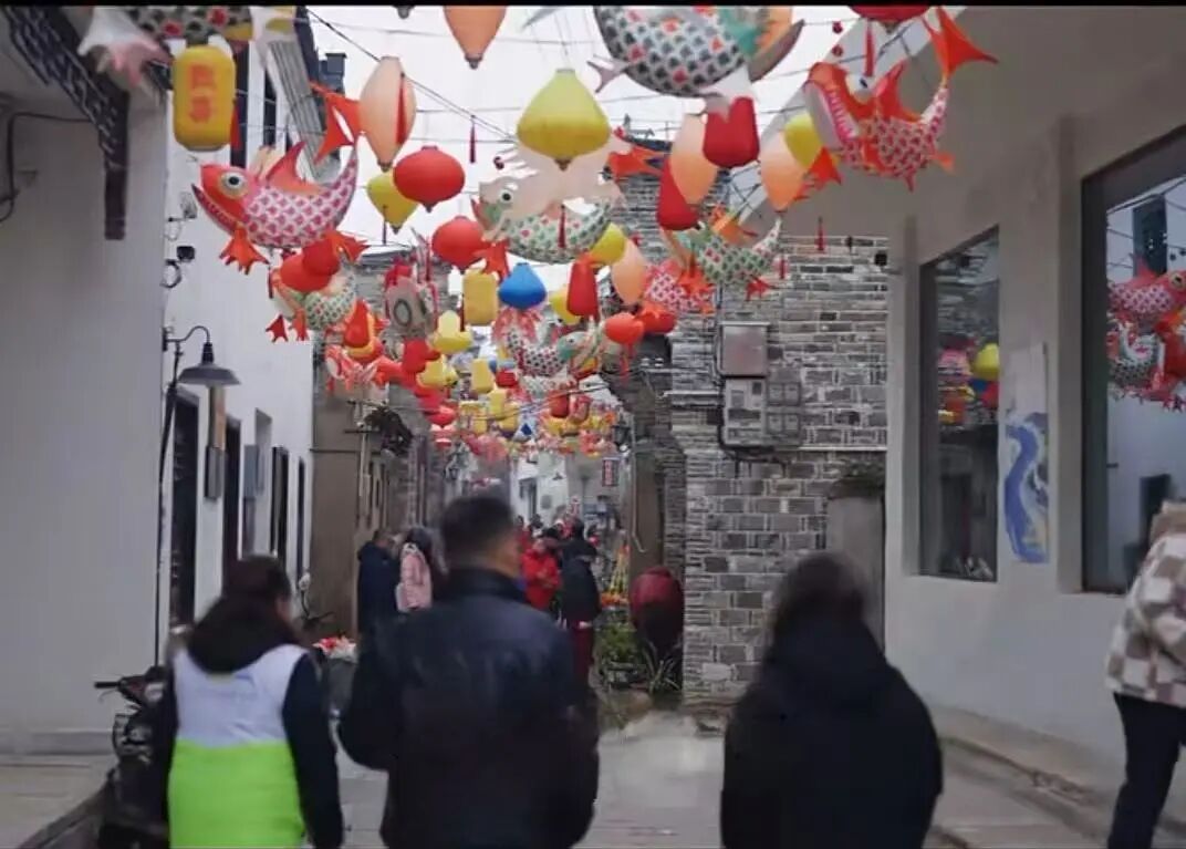 五彩缤纷的鱼灯、海棠灯、菊花灯以及各式灯笼,从东流老街沿着街巷一路延伸到月亮湖畔,鲜艳的色彩与老街的古朴相映成趣。