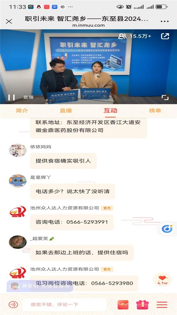 在短短两个多小时的直播时间里,求职者们互动频频,累计观看量高达15.5万人,收获点赞4.1万个,评论互动和留言2600余条,756名求职者拨打了企业应聘热线,来电“火热”。