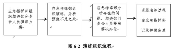 对于较大及以上突发环境事件的应急演练,应由东至县人民政府牵头,应急工作领导小组成员、单位组成,共同参与应急演练,提高各部门应急救援队伍的应急处置能力,加强部门间应急联动、协作。应急演习由应急指挥部统一组织,确定参加演习的人员、演习时间、演习内容等,由水源保护区应急工作领导小组成员协助,针对应急演练系统中某个环节进行演习,由各应急部门组织,并由专人将应急演练过程以录像形式记录下来。演练组织流程见图6-2。
