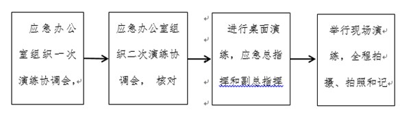 确定演练日期,成立一个临时演练策划组。策划者编制演练方案,确定演练的目标、原则、范围、参演部门,确定演练的性质和方法,选定演练时间与地点,规定演练的时间尺度和公众参与程度;确定实施计划、设计事故情景与处置方案。其中特别要注意的是,演练情景尽可能真实,并考虑应急设备故障问题,以检测备用系统。同时,策划组应确定评价人员数量和应急管理局办公室组织一次演练协调会,讨论演练方案,明确演练分工。应急管理办公室组织二次演练协调会,核对准备进度,反馈问题,筹备桌面演练进行桌面演练,应急总指挥和副总指挥点评桌面演练效果,提出重点注意的问题举行现场演练,全程摄像、拍照和记录整个演习过程。总结演练应具备的专业技能,指定评价人员,分配各自所负责评价的应急组织和演练目标。